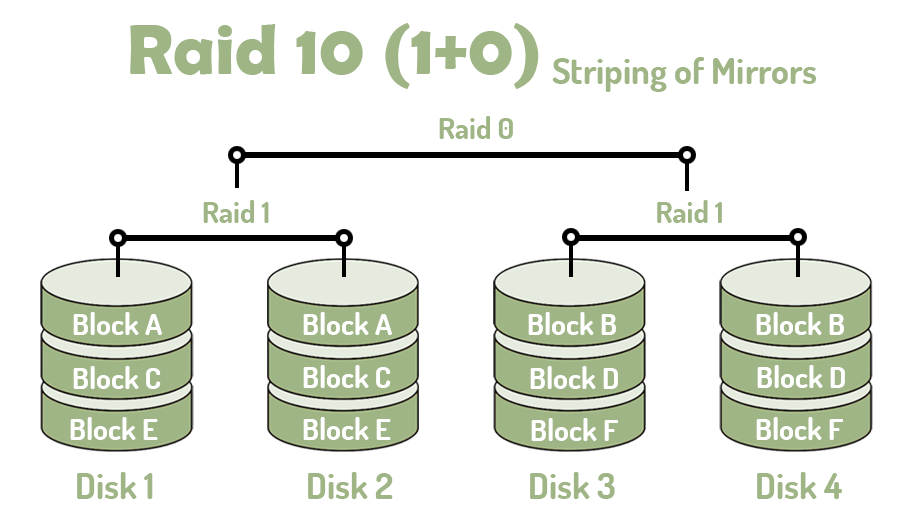 ترکیبی از RAID 0 و RAID 1 است، دادهها برای سرعت بیشترعلیرغم آینه سازی شدن، بین دیسک ها هم تقسیم بندی می شوند