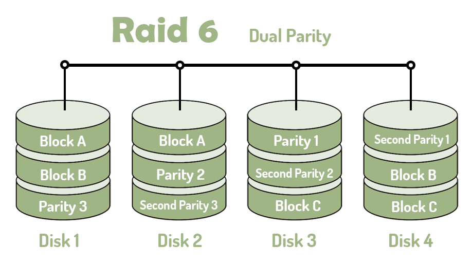 RAID 6 – (Dual Parity)- گران قیمت اما سرعت مطلوب در کنار امنیت بالا