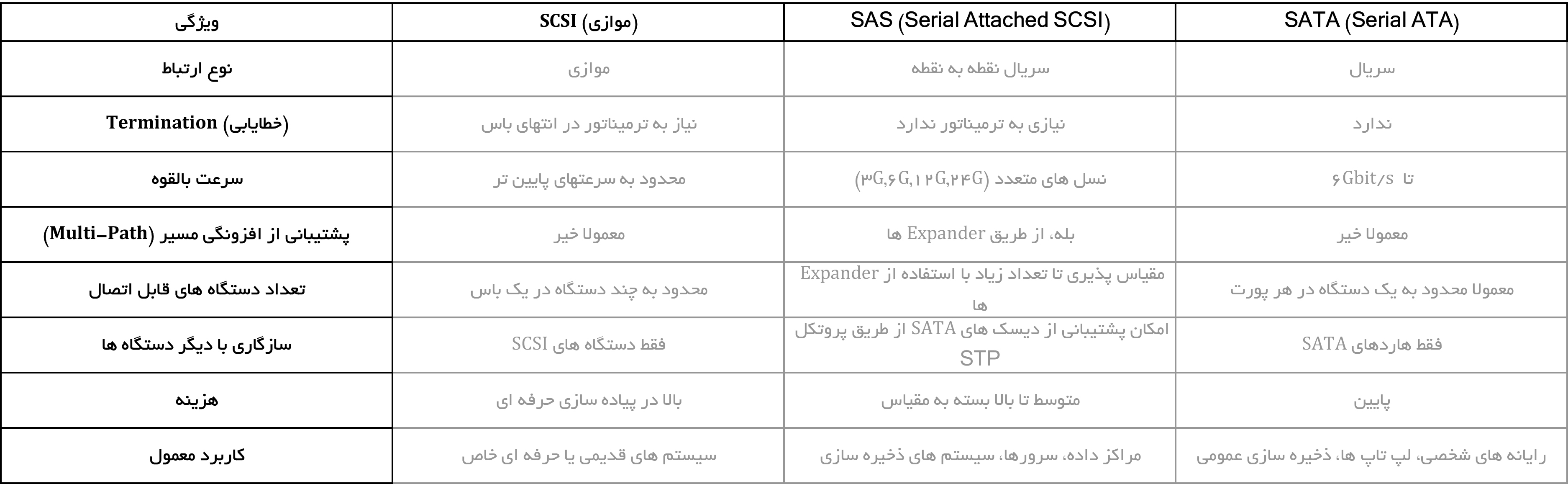 در ادامه، ابتدا تاریخچه و اصول SCSI را بررسی میکنیم، سپس به تکامل آن به سمت SAS میپردازیم، در نهایت SATA را معرفی کرده و مقایسه ای میان آنها انجام خواهیم داد.