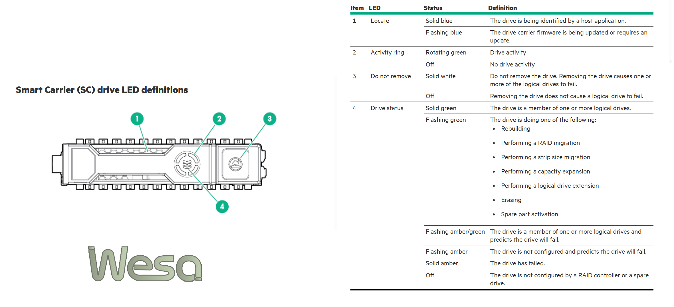 1 – Locate - این LED همانگونه از نامش پیداست، در زمینه پیدا کردن یک هارد کاربرد دارد و به کاربر کمک میکند تا هارد مورد نظر خود را میان باقی هاردها بیابد. این LED، به رنگ آبی میباشد و طبق گفته فایل راهنمای اچ پی، اگر بصورت ثابت روشن شود، بدین معناست که هارد مورد نظر توسط نرم افزارهای نصب شده روی سرور (مانند SSA) در حالت انتخاب و یا شناسایی می باشد. اگر هم بصورت چشمک زن ظاهر شود، احتمالا فریمور هارد مورد نظر در حالت آپدیت بوده یا آن هارد نیاز به آپدیت فریمور دارد.