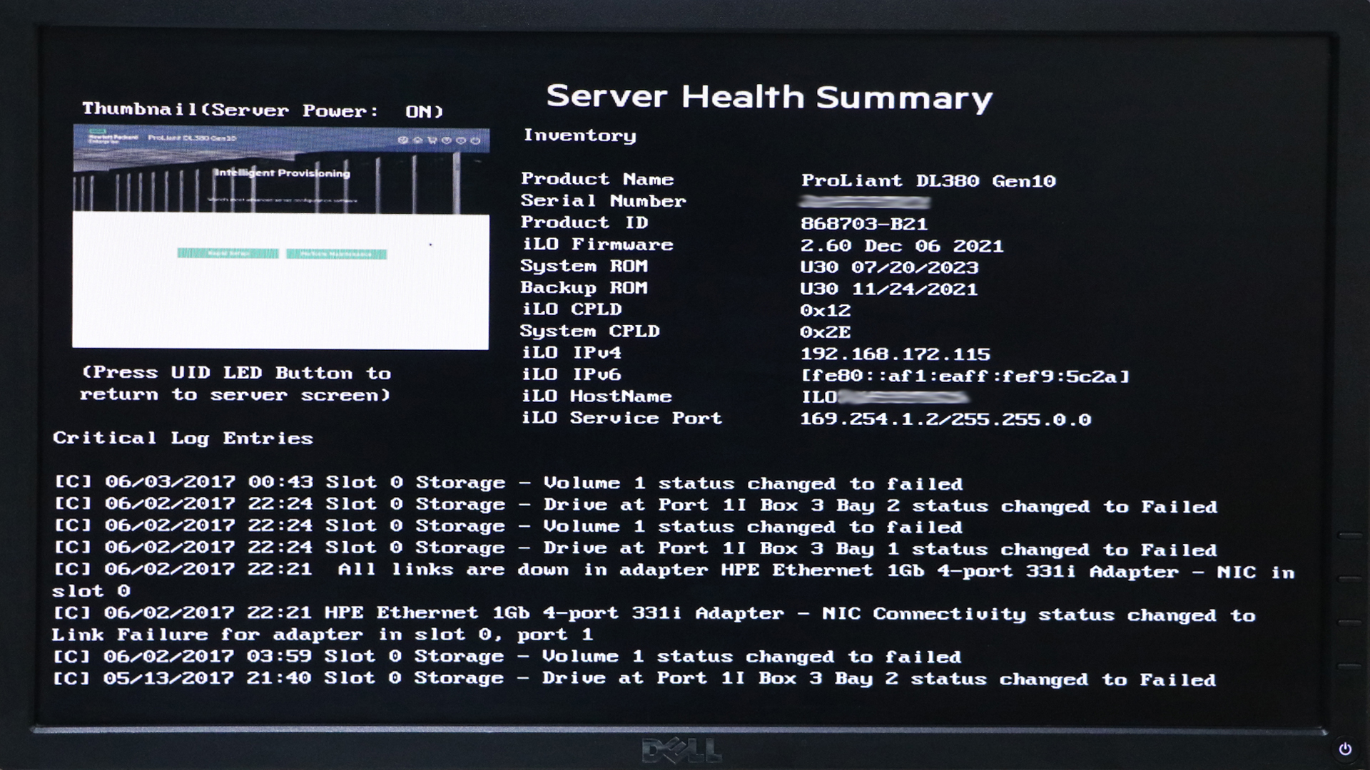 در نسلهای قدیمی تر سرورهای اچ پی، زمانی که سرور خاموش بود و فقط به برق وصل بود، با زدن کلید uid ، گزارش سلامت سرور روی مانیتور لوکال نمایش داده میشد، اما از نسل دهم سرورهای اچ پی، در هر محیطی که باشیم، حتی زمانی که سیستم عامل هم بالا آمده باشد، با یکبار زدن کلید uid میتوانیم server health summary را، روی مانیتور لوکال ببینیم و با زدن مجدد کلید، می توانیم خلاصه گزارش را ببندیم. در زیر نمونه تصویر مانیتورمتصل به سرورمشاهده میشود و همانطور که در تصویر مشخص است، میتوانیم health summary سرور را ببینیم، که شامل، اسم محصول، پارت نامبر، سریال نامبر، ورژن فریمور آیلو و ROM سرور، آی پی iLO و در نهایت لاگهای critical سرور نشان داده شده.